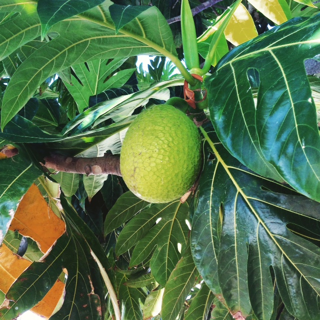 カパフルの住宅街を歩いていて、きれいなプルメリアと、ブレッドフルーツの実を見つけました。