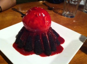チョコレートケーキの上に大きなマカデミアナッツアイスクリームが乗っていて
