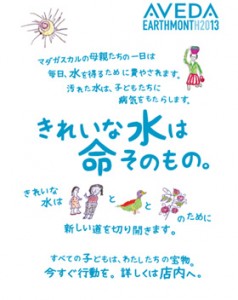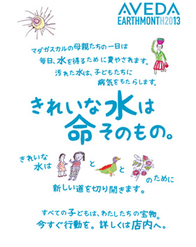 4月22日のアースデーを記念して、アヴェダでは4月の1ヶ月間を「アースデー月間」と定め、世界中のアヴェダ サロン・スパ・ショップで心をひとつにして環境保全活動・募金活動に取り組んでいます。アースデー月間がスタートした1999年以降、これまで3200万ドルの募金を集めることができました。そのうち、過去7年間で集められた2600万ドルもの募金は、世界中の「きれいな水」を 守る活動のサポートにあてられています。